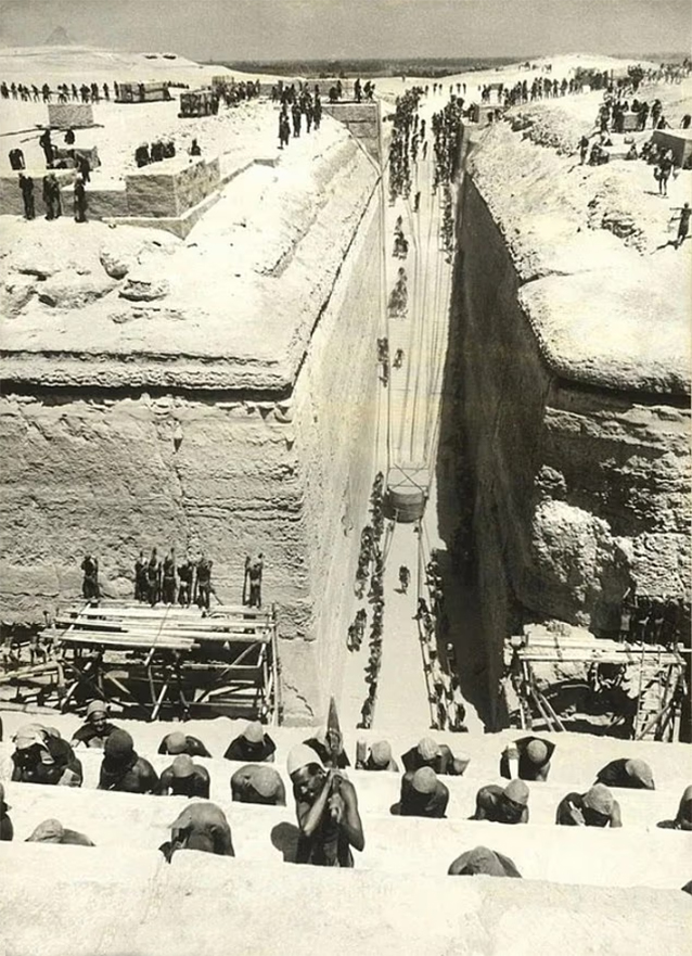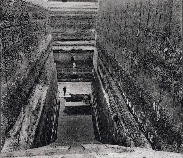 Ο αρχαιολόγος Αλεσάντρο Μπαρσάντι ανέσκαψε για πρώτη φορά την τοποθεσία Ζαουιέτ Ελ Άριαν στις αρχές του 1900, αποκαλύπτοντας ένα κολοσσιαίο λάκκο σε σχήμα Τ λαξευμένο στον συμπαγή ασβεστόλιθο, βάθους σχεδόν 30 μέτρων και επενδεδυμένο με τεράστιους γρανιτένιους ογκόλιθους. Image: Supplied