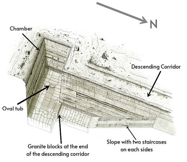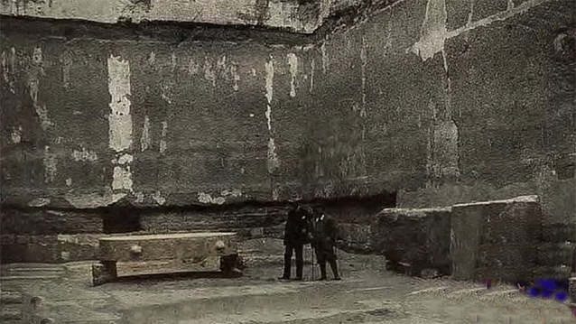 O τελετουργικός θάλαμος που δεν ολοκληρώθηκε ποτέ. Στο κέντρο του υπήρχε μια οβάλ δεξαμενή, με ενσωματωμένο γρανιτένιο καπάκι, η οποία, σύμφωνα με τον Μπαρσάντι, περιείχε ίχνη μιας άγνωστης ουσίας, η οποία τώρα έχει χαθεί. Image: Supplied